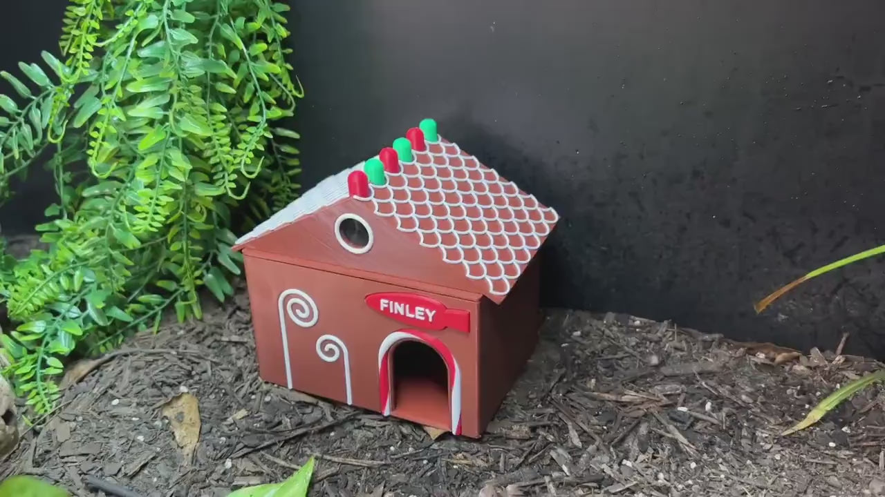 Add a sweet holiday touch to your reptile’s enclosure with the Gingerbread House Humid Hide! Designed to look like a festive cookie cottage with customizable gumdrop colors, candy accents, and a personalizable Swedish-fish nameplate, this cheerful hide brings both charm and function to your setup.